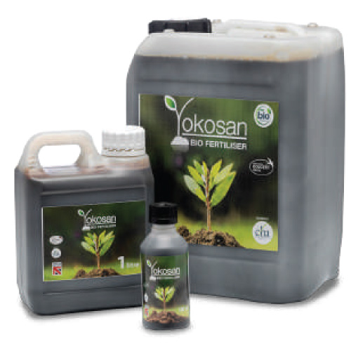 Yokosan is an ECOCERT-certified liquid fertilizer enriched with potassium humate, worm cast extract, beneficial microorganisms, and trace minerals. It promotes balanced plant nutrition, strong root development, and resilience against stress. Its natural composition makes it safe for the environment and ideal for organic farming.